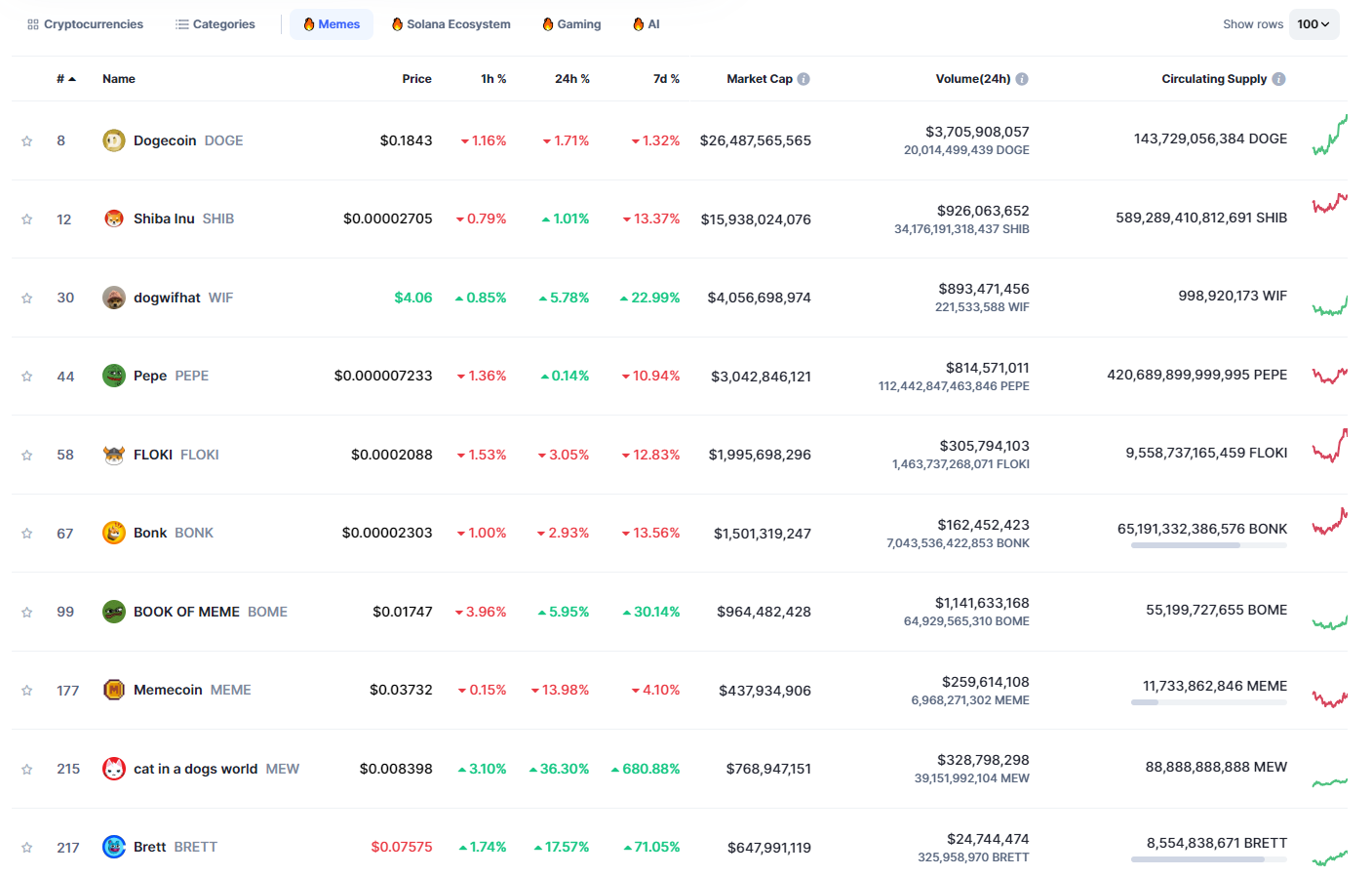 Celková kapitalizácia meme coinov bola počas 1. apríla 2024 na úrovni 70 miliárd dolárov, hlavne vďaka novým tokenom, akými sú napríklad Dogwifhat (WIF), Book of Meme (BOME) alebo Pepe coin (PEPE). Token WIF sa stal v poslednom marcovom týždni najziskovejšou kryptomenou spomedzi top 100.