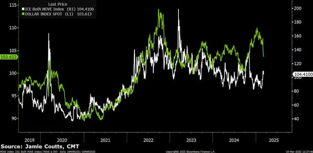 „Hoci sa môj analytický rámec mení na pozitívny, pretože dolár klesá, stále existujú dva varovné signály: volatilita štátnych dlhopisov (MOVE Index) a spready korporátnych dlhopisov,” uvádza Coutts vo svojom príspevku na sociálnej sieti X.