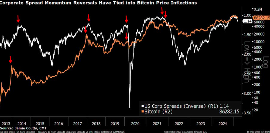 Spready korporátnych dlhopisov sú ďalším dôležitým ukazovateľom budúceho vývoja BTC. „Už tri týždne po sebe sa neustále rozširujú a historicky sa zásadné obraty v týchto spreadoch zhodovali s cenovými vrcholmi Bitcoinu,” upozorňuje Coutts.