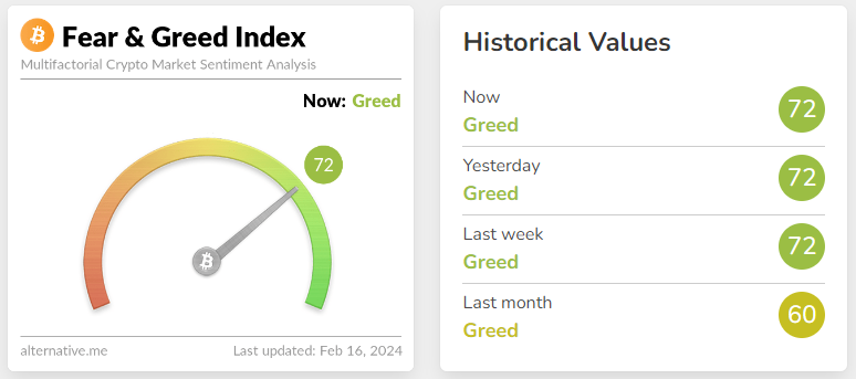 V čase písania sa index nachádza na hodnote 72 bodov, čo je definované ako chamtivosť. Nedávno 13. februára bolo zaznamenaných až 79 bodov, čo sme naposledy mohli vidieť v novembri 2021, kedy Bitcoin začal svoju dlhodobú korekciu. Je ale potrebné poznamenať, že obdobie chamtivosti je dlhodobé pokiaľ sa kryptomeny nachádzajú v bullrune.