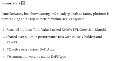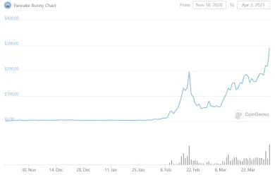 Pre mňa najzaujímavejším je ich BUNNY token, ktorý počas marca stúpol o 600% z približne 50 USD na 300. Takisto aktuálna trhová kapitalizácia tohto tokenu je len 145 miliónov, čo mu umožňuje ďalší rast. Prípadnému rastu tohto tokenu nahráva aj fakt, že pomer trhovej kapitalizácie BUNNY voči TVL je aktuálne okolo 0,15. Pre porovnanie – CAKE voči PancakeSwap TVL má pomer 0,5 a Uniswap má tento pomer dokonca až 3.