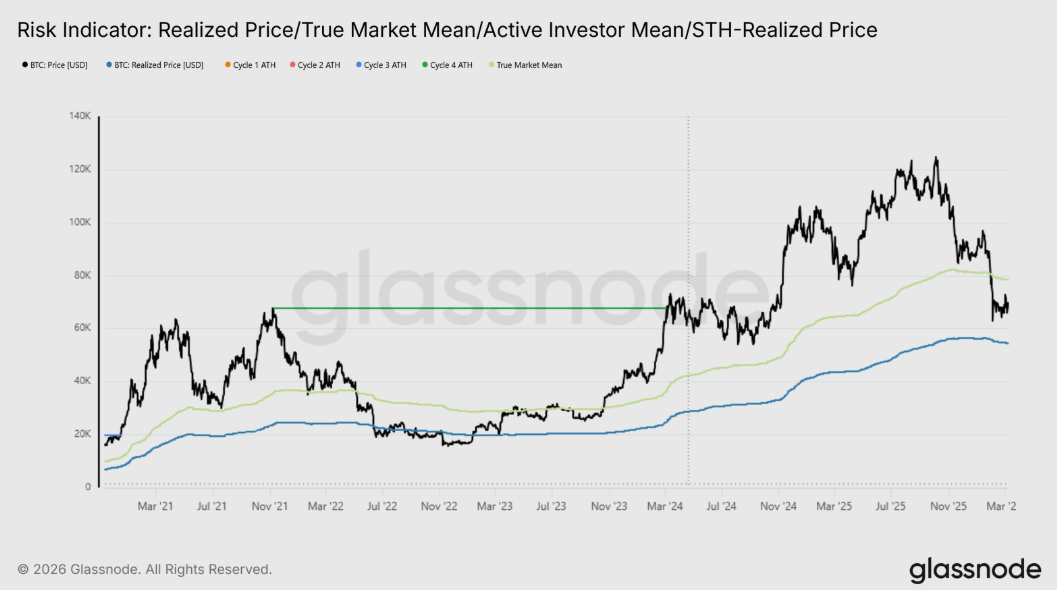 Bitcoin a jeho realizovaná a férová cena. Zdroj: glassnode.com