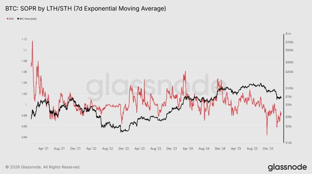 Výraznou brzdou trhového rozmachu je pokračujúca strata ziskovosti nových účastníkov trhu. Túto situáciu monitoruje ukazovateľ STH-SOPR, ktorý porovnáva nákupnú a predajnú cenu u krátkodobých držiteľov. Keď tento index klesne pod hodnotu 1 , znamená to, že táto skupina investorov realizuje straty. Od októbra 2025 sa tento ukazovateľ drží pod touto kritickou hranicou a aktuálne dosahuje hodnotu 0,985 %.