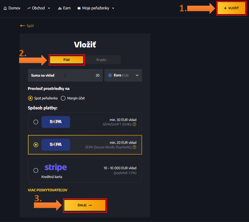 Funguje to tak, že jednoducho si určíte, ako často budete posielať na burzu peniaze, a následne nakupujete konkrétne kryptomeny. Napríklad, každý mesiac zrealizujete nákup za 100 alebo 200 eur. Postup, ako vložiť peniaze na BITmarkets, je zobrazený na obrázku nižšie.