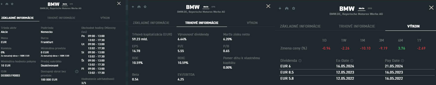 Druhým príkladom dividendovej akcie je BMW s dividendovým výnosom 6,44 % v čase písania. BMW vypláca dividendu raz ročne v máji. Posledná hodnota dividendy v dolároch predstavovala 6 eur v hrubom.