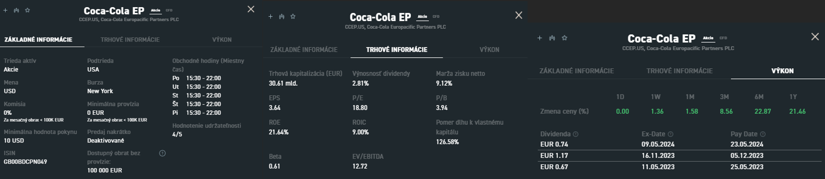 Typickým príkladom dividendovej akcie je Coca-Cola. V čase písania dosahuje dividendový výnos Coca Coly 2,81 %. Na XTB taktiež môžete po rozkliknutí firmy vidieť detaily o obchodných hodinách, minimálnej hodnote pokynu, trhových informáciách, výnosnosti dividendy a taktiež o tom, kedy sú dividendy pripisované na účet.