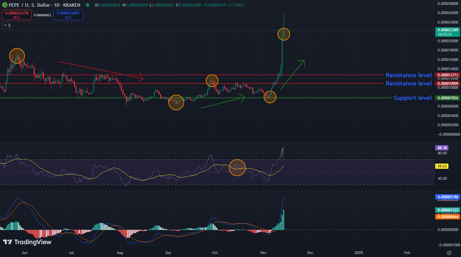 Momentálne je PEPE ocenený na 0,00002246 dolára, čo sa blíži k jeho historickému maximu 0,00002457 dolára. Nedávny nárast ceny pepe coinu prelomil niekoľko kľúčových úrovní odporu. Aktuálna podporná úroveň je okolo 0,000007826 dolára, zatiaľ čo odpor je na úrovni 0,000012713 dolára. To ukazuje silný vzostupný momentum PEPE. Jeho 10-dňový kĺzavý priemer je 0,000013428 dolára a 50-dňový kĺzavý priemer je 0,000010456 dolára, čo tiež podporuje vzostupný trend. Relatívny index sily (RSI) je na úrovni 88,88, čo ukazuje vysoký dopyt, hoci táto úroveň tiež naznačuje, že PEPE môže byť prekúpený.
