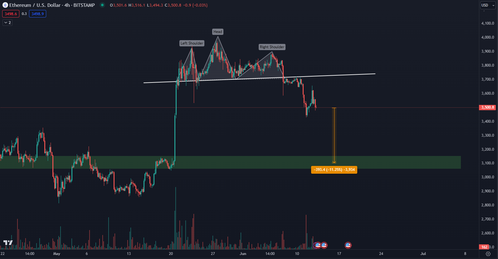 Keďže volatilita je vysoká a cena sa od zverejnenia statusu Brandta pohla, poďme si aktualizovať cenový graf Etherea. Na grafe nižšie vidíte načrtnutý vzor Head and shoulders. Ide o pattern, v ktorom sú dve ramená nižšie ako hlava medzi nimi. Potvrdenie tohto vzoru nastane vtedy, ak cena prekoná support z miním (biela línia).