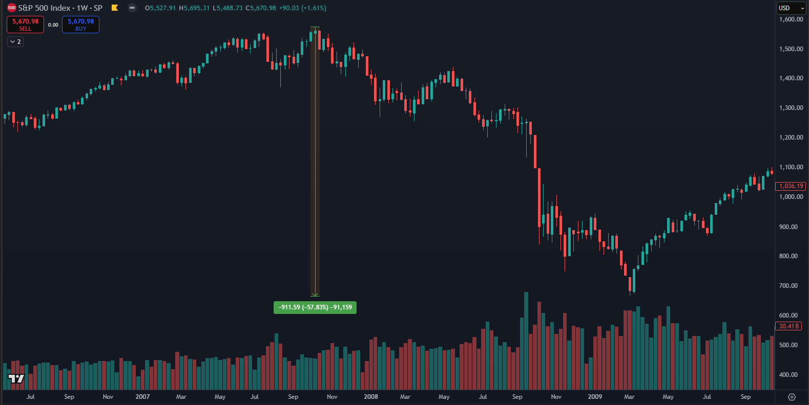Pád amerických akcií v roku 2008. Zdroj: tradingview.com