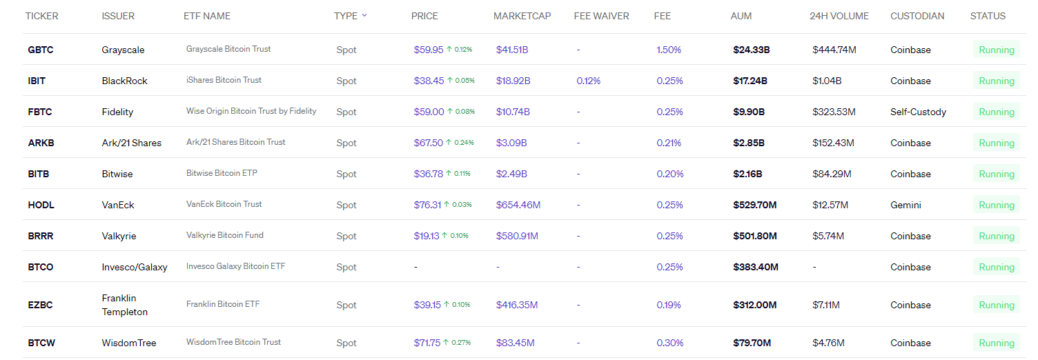 Do začiatku tohto týždňa sme boli svedkami nepretržitého 19-dňového prílevu kapitálu do spotových ETF na Bitcoin. Na obrázku nižšie môžete vidieť ETF zoradené podľa objemu kapitálu pod správou. Zároveň môžeme zhodnotiť, že najrýchlejšie tempo rastu má ETF od najväčšieho správcu aktív na svete BlackRock.