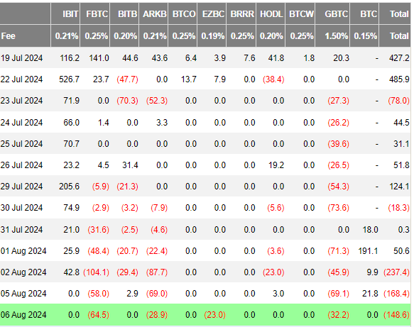 Podľa najnovších údajov Farside skutočné odlivy v bitcoinových ETF pokračovali aj v utorok. Zatiaľ čo v pondelok došlo k čistým odlivom na úrovni 168,4 milióna dolárov, v utorok to bolo 148,6 milióna dolárov. Avšak najvyšší odliv sme mohli vidieť už v piatok, a to na úrovni 237,4 milióna dolárov.
