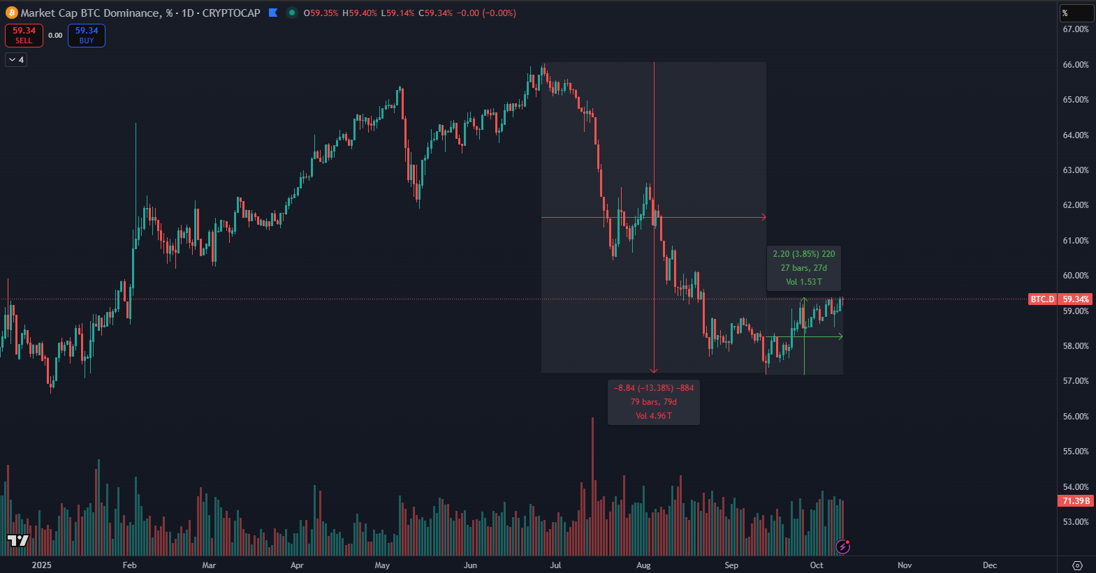 Od polovice septembra sa situácia obrátila. Dominancia Bitcoinu posilnila o takmer 4 % a nachádza sa tesne pod 60 % trhovej kapitalizácie. Tento obrat naznačuje, že Bitcoin narazil na dno, od ktorého sa odráža. Je to logické, keďže Bitcoin nedávno prekonal historické maximum 126 200 dolárov.