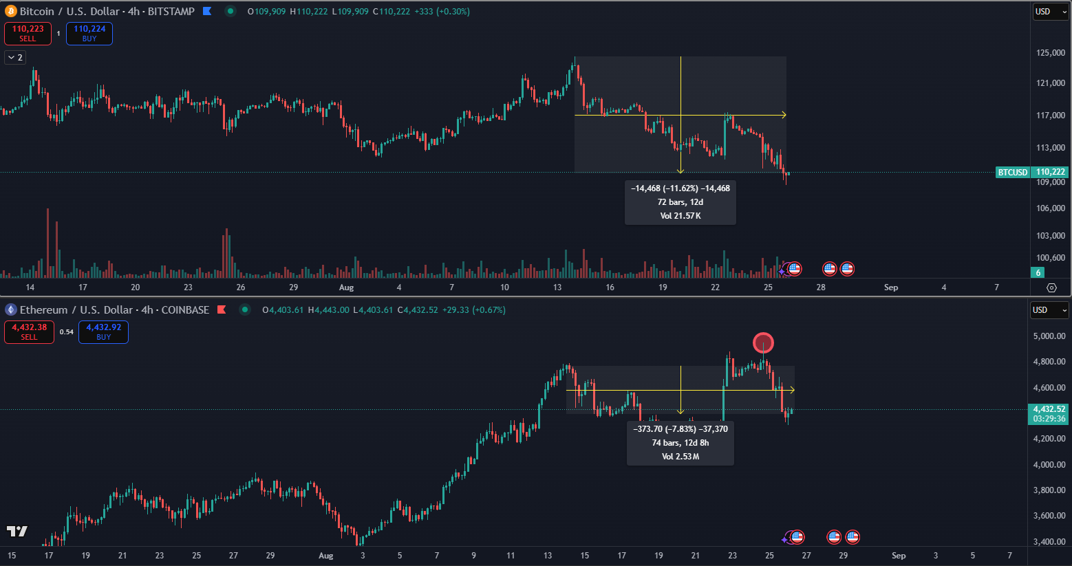 Bitcoin sa dostal do pomerne výraznej korekcie, ktorá prekvapila mnohých investorov. Ako ukazujú údaje z TradingView, cena najväčšej kryptomeny klesla z historického maxima 124 500 dolárov na súčasných 110 000 dolárov. Tento pokles predstavuje viac ako 11,50 % za necelé dva týždne, čo je najväčší prepad od februára a marca 2025. Na prvý pohľad by sa mohlo zdať, že ide o štandardnú korekciu, no trh tentokrát ukazuje odlišnú dynamiku.