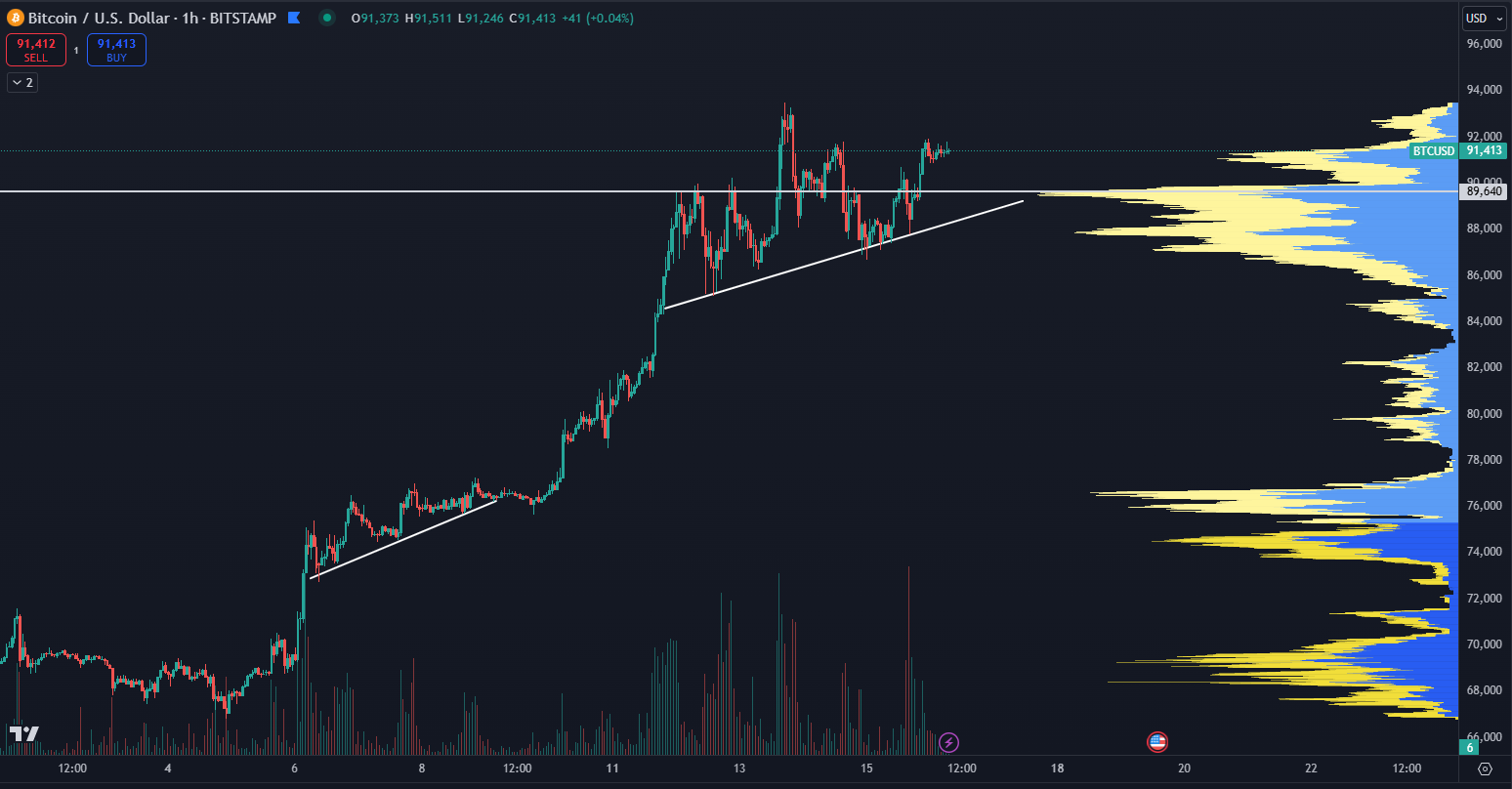 Bitcoin zaznamenal za posledné 4 dni prevažne stabilný cenový vývoj do strany okolo hodnoty 89 000 dolárov. Dňa 13. novembra bolo zaznamenané historické maximum 93 483 dolárov a odvtedy sa cene nepodarilo dosiahnuť vyššiu hladinu. Napriek tomu štruktúra trhu naznačuje, že rast sa ešte neskončil.