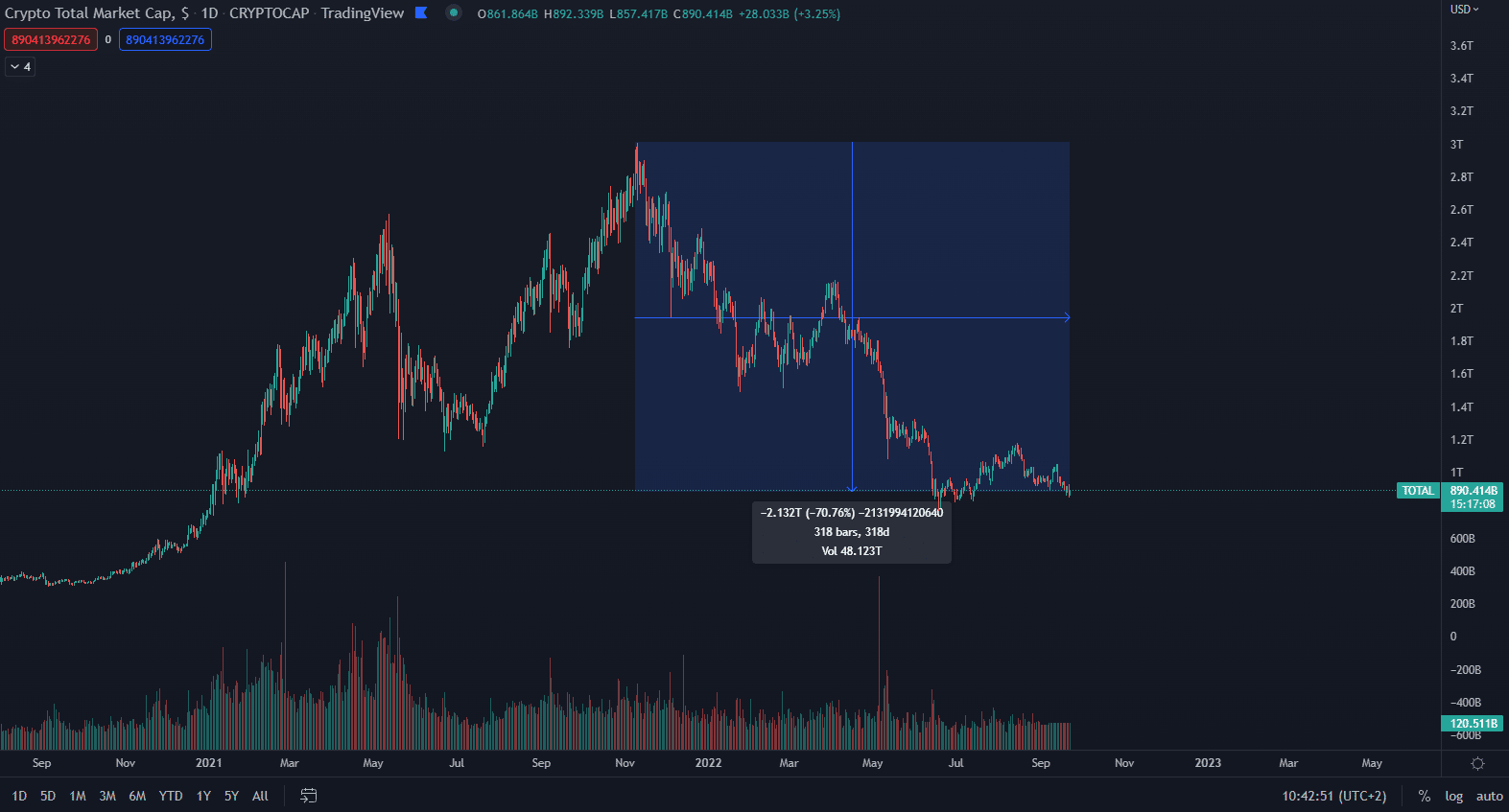 Medzitým trhová kapitalizácia kryptomien pokračuje v klesajúcom trende a v čase písania článku dosahuje hodnotu 889 miliárd dolárov. Od svojho novembrového maxima klesla už o 70 %. Bitcoin taktiež klesol za rovnaké obdobie o 73 %. Nedávno bolo dokonca z trhu odčerpaných 165 miliárd za jediný týždeň.