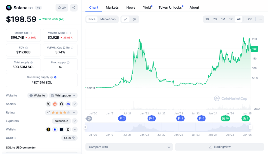 Cena kryptomeny SOL. Zdroj: coinmarketcap.com
