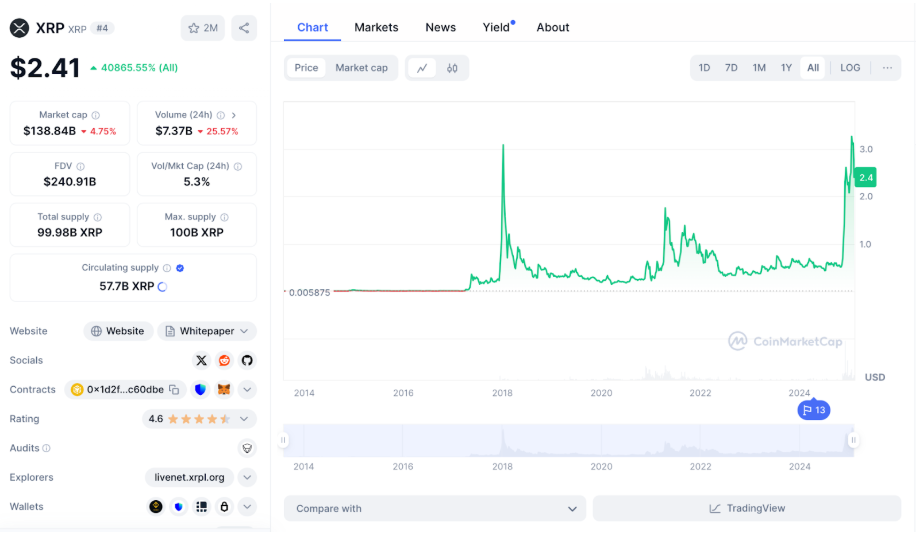 Graf XRP naznačuje pozitívny výhľad, pričom cena nedávno vystrelila na 2,41 dolára po dlhom období konsolidácie. Tento pohyb signalizuje obnovené nákupné momentum a silný záujem investorov. Nárast obchodného objemu podporuje pravdepodobnosť pokračujúceho rastu, zatiaľ čo zavedené úrovne podpory poskytujú pevný základ. Keďže neexistujú žiadne okamžité obavy z riedenia a trhová dôvera rastie, XRP má dobrú pozíciu na ďalšie zhodnotenie v tomto roku, potenciálne testujúc kľúčové úrovne rezistencie.