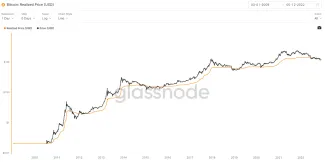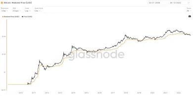 Graf nižšie zobrazuje porovnanie trhovej (čierna krivka) a realizovanej (oranžová krivka) ceny. Z historického hľadiska klesnutie trhovej ceny pod realizovanú cenu vždy predstavovalo životnú investičnú príležitosť. Trh sa dostal do pásma nerealizovaných strát, čo sa stane iba raz za čas.