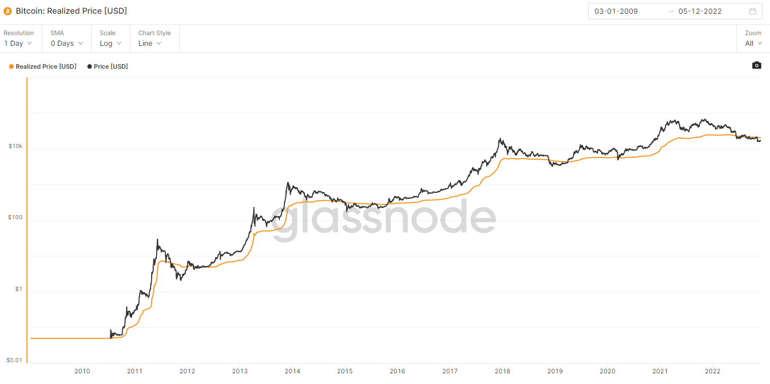 Graf nižšie zobrazuje porovnanie trhovej (čierna krivka) a realizovanej (oranžová krivka) ceny. Z historického hľadiska klesnutie trhovej ceny pod realizovanú cenu vždy predstavovalo životnú investičnú príležitosť. Trh sa dostal do pásma nerealizovaných strát, čo sa stane iba raz za čas.