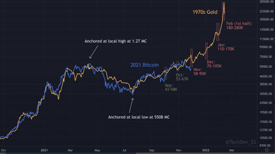 Korelácia BTC a zlata. Zdroj: TechDev/Twitter