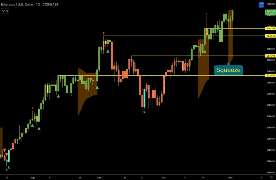 Údaje z TradingView ukazujú, že od obchodovania na minime 2 780 USD z dňa 29. septembra sa cena ETH zvýšila o 62,54 % za niečo vyše mesiaca, čím sa 2. novembra vytvorilo nové historické maximum na úrovni 4 523 USD.