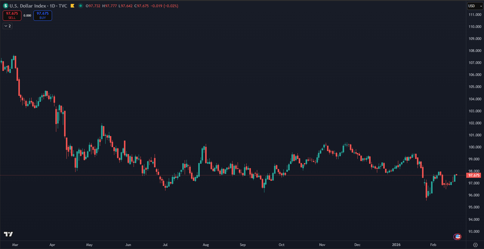 Podľa kryptomagazínu News Bitcoin investori aktuálne držia voči americkému doláru najväčšie short pozície za viac než desaťročie. Dolárový index DXY sa podľa TradingView pohybuje okolo hodnoty 97,7 bodu a smeruje k medziročnej strate 9 %. Analytici z Bank of America upozornili, že podváženie dolára kleslo pod úrovne z roku 2025 a dosiahlo najnižšie hodnoty od začiatku sledovania v roku 2012.