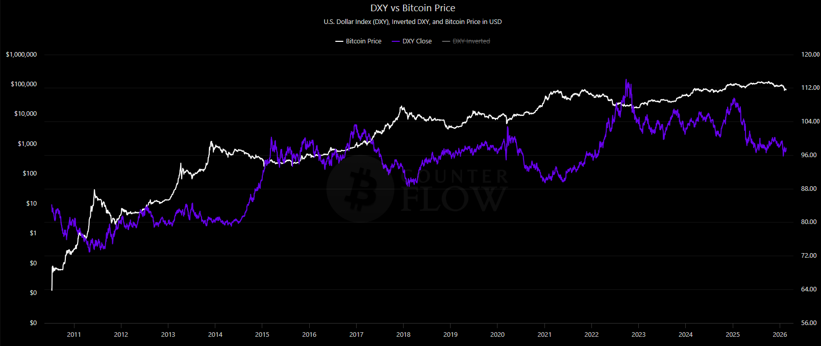 Korelácia BTC a DXY. Zdroj: bitcoincounterflow.com/charts/dxy