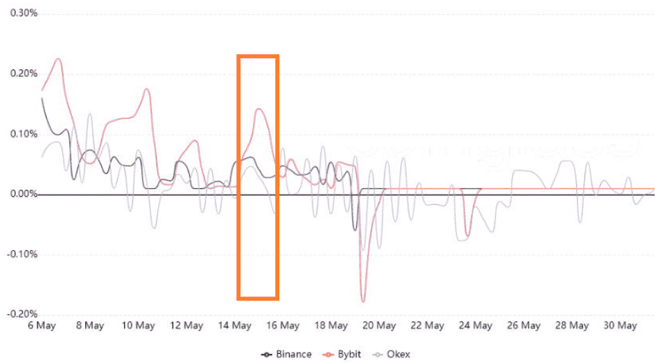 Neutrálne trhy majú tendenciu vykazovať pozitívnu mieru financovania od 0 % do 0,03 %, čo zodpovedá 0,6 % za týždeň. To naznačuje, že to platia long pozície. Priemerná sadzba pred pádom z 15. mája bola o niečo vyššia na úrovni 0,075 %. To je zhruba 1,6 % za týždeň. V tomto čase longové pozície nevykazovali žiadne známky nadmerného pákového efektu.