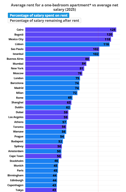 V Lisabone dosahuje pomer nájmu k platu až 116 %, čo znamená, že nájom zhltne viac, než človek zarobí. Podobne je na tom Istanbul, kde pomer dosahuje 102 %. To znamená, že ľudia musia hľadať ďalší príjem alebo bývať mimo centra.