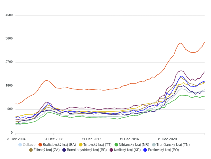 Podľa údajov NBS je najdrahšie bývanie na Slovensku v Bratislavskom kraji s priemernou cenou 3 486 eur/m², čo výrazne prevyšuje slovenský priemer 2 700 eur/m². Nasleduje Košický kraj s cenou 2 349 eur/m², pričom tempo rastu cien v Košiciach predbehlo aj Bratislavu. Najlacnejšie bývanie je v Nitrianskom kraji, kde sa priemerná cena pohybuje len na úrovni 1 389 eur/m².
