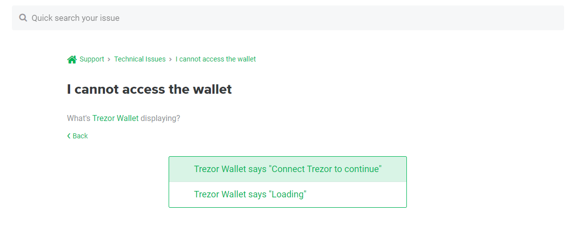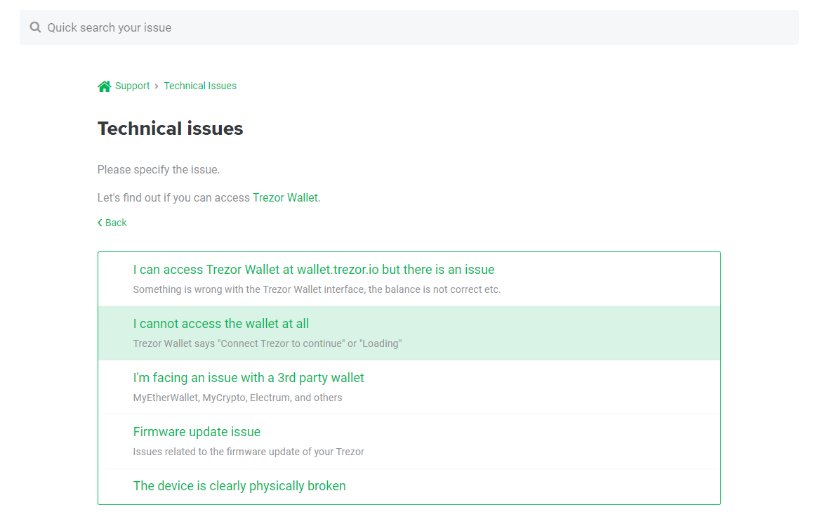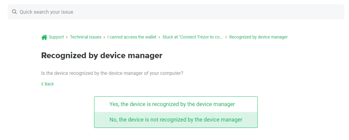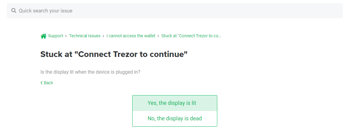 Zašiel som teda na oficiálnu stránku Trezor.io, klikol v menu na support, klikol na „Technical issues“ a pre istotu som spravil mini testík, ktorý mi web ukázal. Stačilo proste pripojiť Trezor k PC. Zariadenie, ako inak, nefungovalo a nič sa nestalo. Tak som klikol „skip“ a dostal som sa na ďalšiu stránku, kde som špecifikoval problém. Neviem sa dostať do svojej peňaženky.