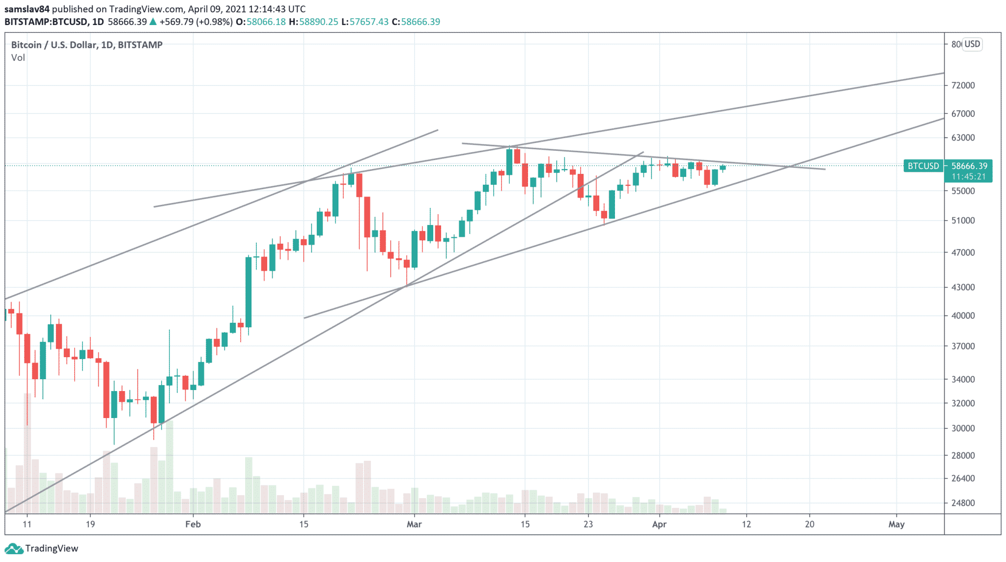 Od konca februára sa začala vytvárať nová, menej strmá stúpajúca trendline, ktorú Bitcoin niekoľkokrát otestoval. Zdá sa, že trh rešpektuje log graf a ešte tento týždeň by sme sa mali dočkať ďalšieho pokusu o prekonanie hladiny 60 000 dolárov. Ak bude úspešný, pravdepodobne budeme pokračovať na nové historické maximum.