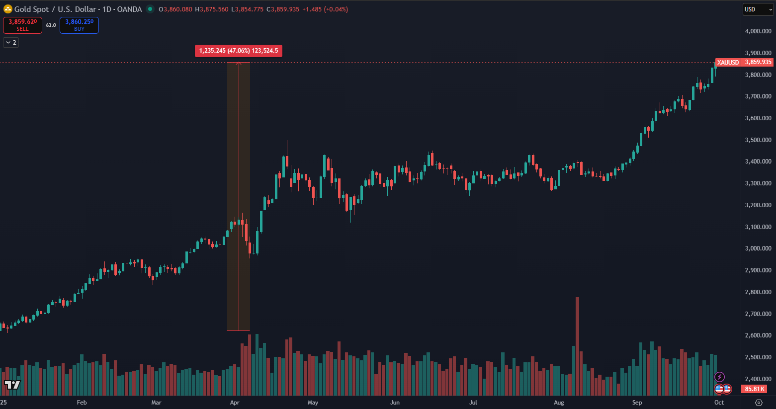 Zlato a jeho vzostup v roku 2025. Zdroj: tradingview.com