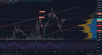 Cena pokračuje krátkodobo v raste a smeruje na target zhruba 2,63 $. Z dlhodobého hľadiska môžeme identifikovať rastúcu vlajku, ktorej support bol rešpektovaný aj pri tvorbe posledného minima. Preraziť rezistenciu vlajky, samozrejme, cena môže, ale nie je to nevyhnutné, pretože v súčasnosti je trend aspoň stabilný.