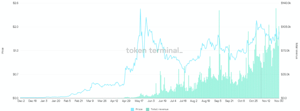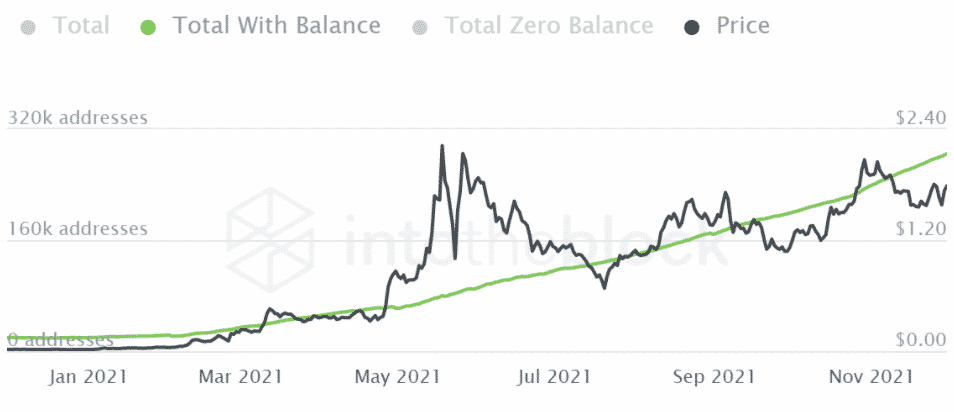 Ako je znázornené v grafe vyššie, počet peňaženiek, ktoré majú zostatok, sa počas roku 2021 neustále zvyšoval a v súčasnosti je na historickom maxime 282 760. Dôkazom zvýšenej aktivity sú aj údaje o celkových príjmoch z poplatkov v sieti, ktoré sa v druhej polovici roku 2021 neustále zvyšovali.