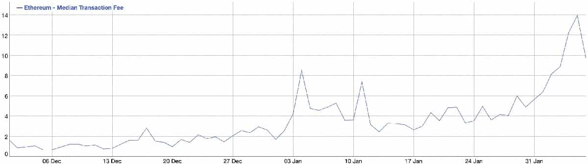 Ak však budete niečo posielať cez Ethereum, pravdepodobne zaplatíte menej. Oveľa zaujímavejšou hodnotou je medián. Ak si zoradíme všetky transakcie podľa poplatku, medián bude cena transakcie v strede. V piatok to bolo 14 $, v sobotu cca 9,8 $. O pár dní by to už mohli byť prijateľnejšie 3-4 doláre.