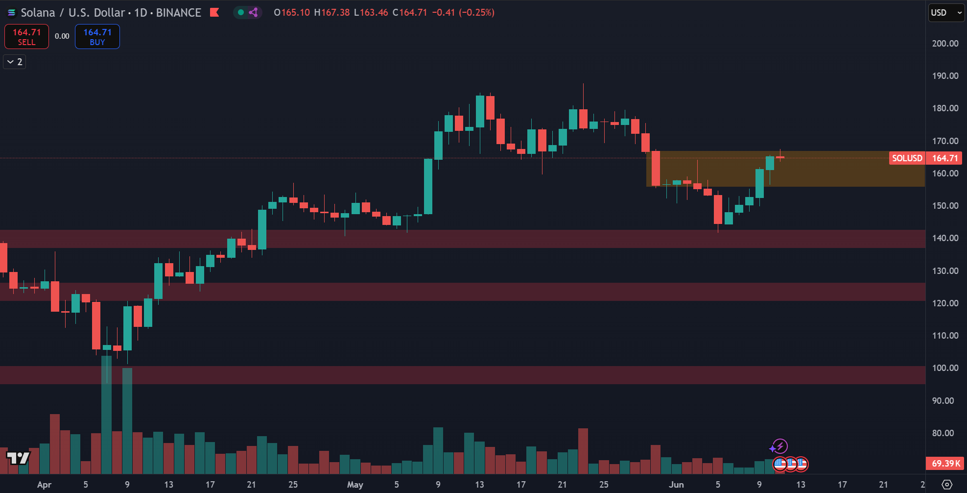 V prípade, že sa trh vydá smerom nadol a Solana vstúpi do klesajúceho trendu, z pohľadu krátkych obchodov môžu byť zaujímavé úrovne okolo 140, 120 a 100 dolárov, kde sa pravdepodobne nachádza likvidita (červené zóny na grafe). Tieto hodnoty slúžia ako logické miesta na výber ziskov. Naopak, ak dôjde k prelomeniu rezistencie a nastane rast, prvou cieľovou úrovňou je hladina okolo 185 dolárov.