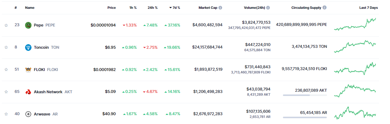 Záujem o PEPE je viditeľný aj na pomere celkového denného objemu obchodovania na trhovej kapitalizácii. Tento pomer dosahuje až 82,63 % podľa údajov CoinMarketCap. Trhová kapitalizácia sa pohybuje na úrovni 4,6 miliardy dolárov a vďaka tomu sa zaraďuje na 23. miesto v celosvetovom rebríčku. Denný objem obchodovania dosahuje až 3,8 miliardy dolárov. PEPE je dokonca najziskovejšou kryptomenou spomedzi top 100 za posledný týždeň.