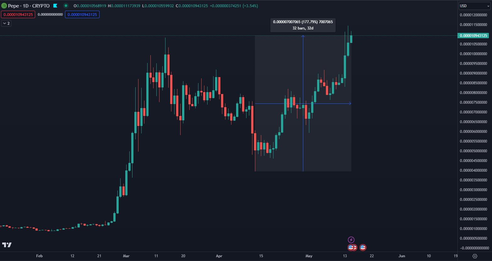 • PEPE sa môže stať novým kráľom meme coinov v súčasnom rastúcom cykle.
