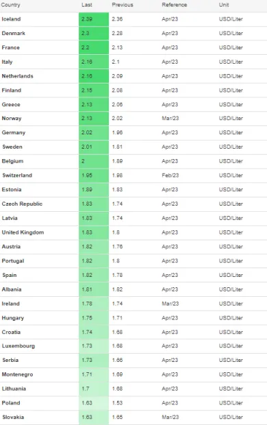 Ako vidíme v tabuľke nižšie, podľa údajov Tradingeconomics Slováci tankujú lacnejšie ako občania vo väčšine európskych štátov. Najdrahší je benzín na Islande (2,39 dolárov/liter), v Dánsku (2,30 dolárov/liter), Francúzsku (2,20 dolárov/liter), Taliansku (2,16 dolárov/liter) a Holandsku (2,16 dolárov/liter).