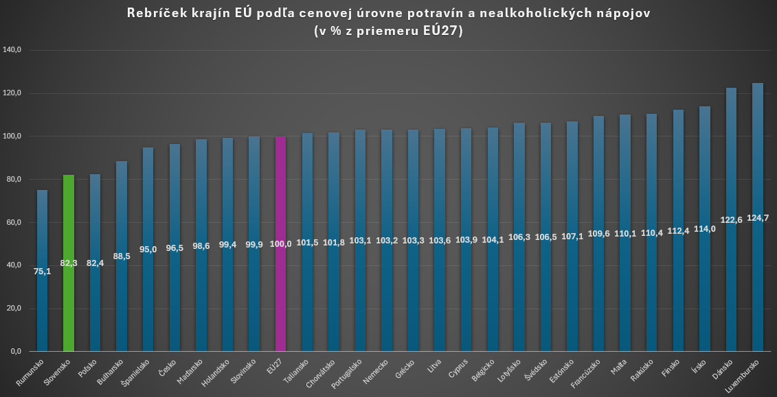 Nižšie cenové úrovne v oblasti cien potravín a nealkoholických nápojov má už len Rumunsko s hodnotou 75,1 % z priemeru EÚ. Naopak, najdrahšie potraviny sú v Luxembursku (124,7 %), Dánsku (122,6 %) a Írsku (114,0 %).