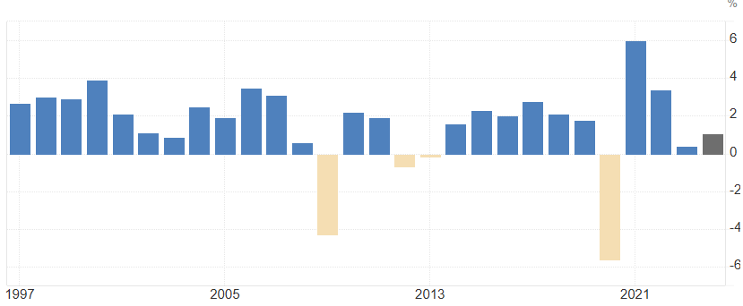 Celoročný rast HDP v Európskej únii klesol na 0,40 % v roku 2023 z 3,40 % v roku 2022. Priemer je 1,64 % od roku 1996 do roku 2023, pričom v roku 2021 bolo dosiahnuté historické maximum 6,00 % a rekordné minimum – 5,60 % v roku 2020, ukazujú údaje z TradingEconomics.