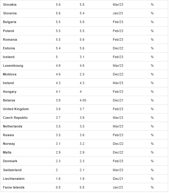 V tabuľkách nižšie, podľa údajov Tradingeconomics, môžete vidieť porovnanie krajín v Európe podľa miery nezamestnanosti. Slovensko sa nachádza približne v polovici zoznamu, no pod priemerom eurozóny, ktorá dosahuje hodnotu 6,6 %. Najvyššiu mieru nezamestnanosti dosahuje Bosna a Hercegovina, Kosovo a Čierna Hora.