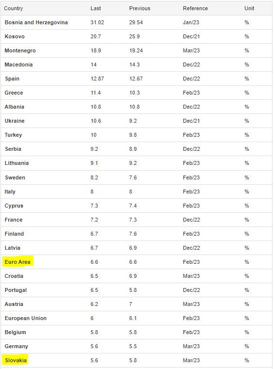 - Krajiny s vyššou nezamestnanosťou ako na Slovensku. Zdroj: Tradingeconomics
