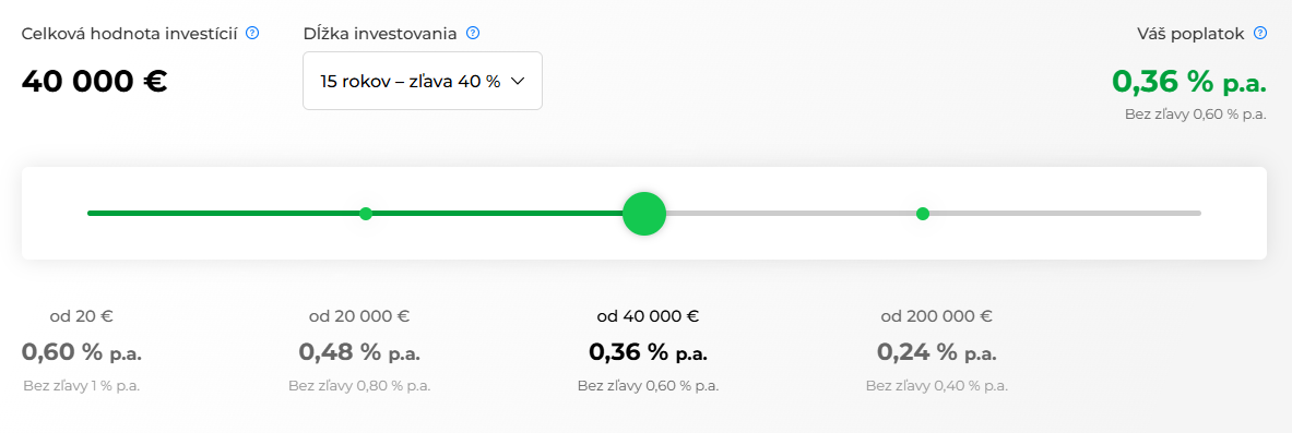 Aby ste mali lepší prehľad o tom, koľko stojí investovanie na Portu, máte k dispozícii online kalkulačku. Na obrázku nižšie vidíte, že pri investovaní 40 000 eur po dobu 15 rokov by váš ročný poplatok za správu predstavoval 0,36 % z hodnoty portfólia.