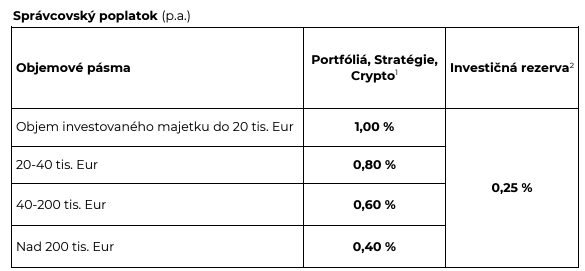 Tabuľka nižšie zobrazuje správcovské poplatky pre základný balík služieb: Portfóliá, Investičná rezerva, Stratégie a Krypto. Pre ostatné skupiny nájdete detailný prehľad tu.