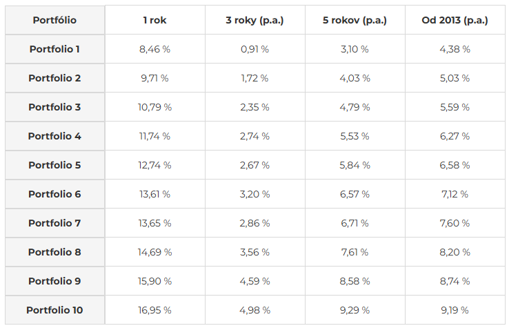 Tabuľka nižšie zobrazuje, aká je priemerná ročná čistá výkonnosť Portu portfólií.