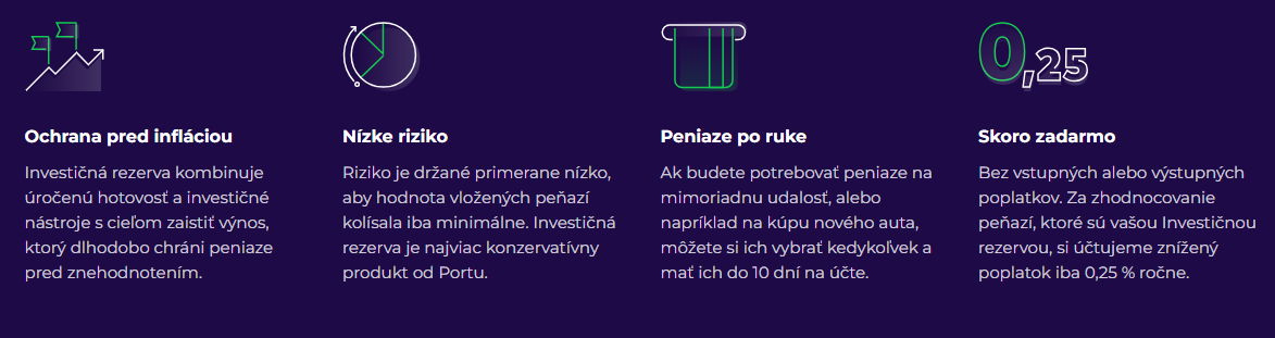 Druhým produktom je investičná rezerva. Ide o vylepšenú alternatívu ku bežnému bankovému účtu, ktorý len znehodnocuje vaše peniaze. Vďaka tejto službe úročíte úspory a chránite peniaze pred infláciou. Zároveň je riziko minimálne, aby nedochádzalo k vyšším výkyvom. Ide o najkonzervatívnejší produkt od Portu.