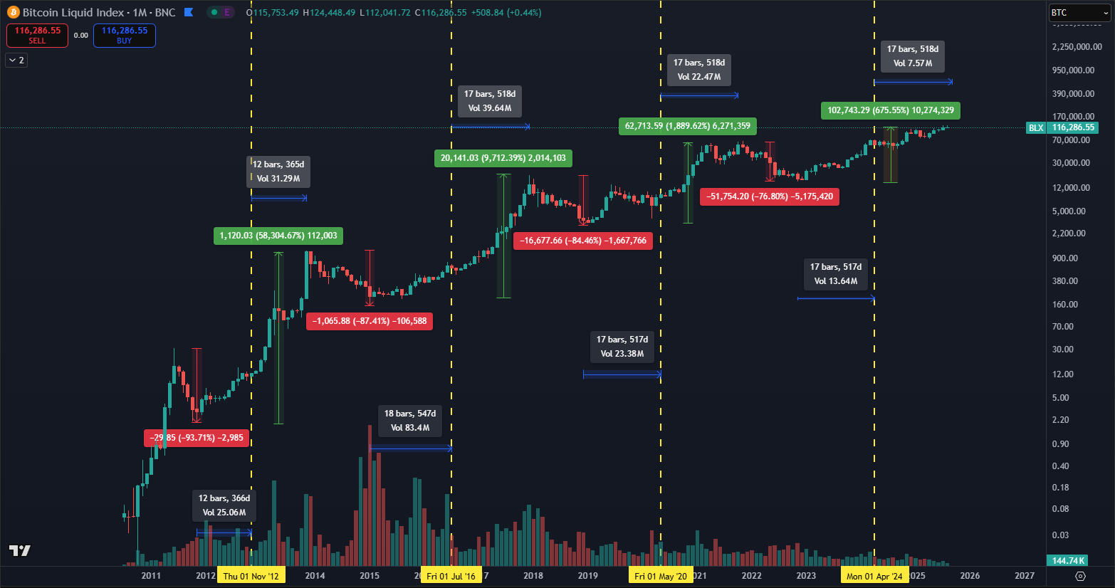 Analýza predchádzajúcich halvingových cyklov naznačuje, že vrchol trhu prichádzal približne 518 dní po halvingu. Tento časový rámec sa presne zhoduje so súčasnosťou, čo znamená, že trh môže dosiahnuť vrchol už v priebehu najbližších týždňov. Ak sa história zopakuje, Bitcoin má pred sebou poslednú rastovú vlnu pred tým, než príde dlhšia konsolidačná fáza.