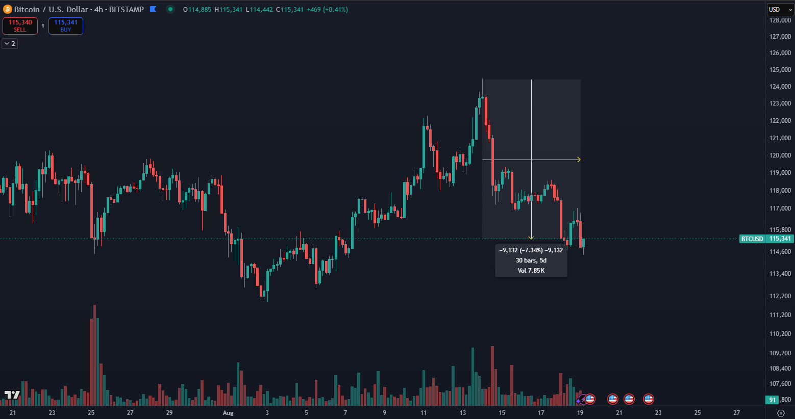 Kryptomeny sa opäť dostávajú do centra pozornosti po tom, čo podľa údajov z TradingView Bitcoin zaznamenal výraznú korekciu. Z historického maxima 124 500 dolárov klesol na 115 000 dolárov, čo predstavuje prepad o viac ako 7 % počas piatich dní. Tento vývoj môže vyzerať negatívne, no v skutočnosti ponúka investorom poslednú možnosť vstúpiť na trh pred potenciálnym ukončením súčasného cyklu.